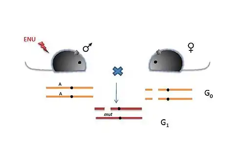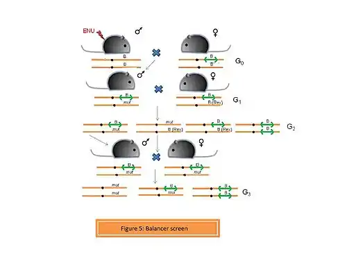 A chromosome carrying a balancer region is termed as a balancer chromosome. A balancer is a region which prevents recombination between homologous chromosomes during meiosis. This is possible due to the presence of an inverted region or a series of inversions. Balancer chromosome was primarily used for studies in Drosophila melanogaster genetics. Monica Justice et al. (2009) efficiently carried out a balancer screen using a balancer chromosome constructed by Allan Bradley et al. on mouse chromosome 11. In this screen, an ENU-induced male is crossed with a female heterozygous for the balancer chromosome.[8] The mice carrying the balancer chromosome have yellow ears and tail. The G1 heterozygotes are (Figure 5) are crossed to females carrying the rex mutation (Rex in figure 5), which confers a curly coat. In G2, homozygotes for the balancer are non-viable and are not recovered. Mice carrying the rex mutation trans to the balancer or ENU-induced mutation have a curly coat and are discarded. The ENU mutant + rex mutant mice are discarded in order to prevent recombination between those two chromosomes during the next breeding step, which is generating homozygous mutants. Mice that are compound heterozygotes for the balancer and the ENU-induced mutation are brother-sister mated to obtain homozygotes for the ENU-induced mutation in G3.