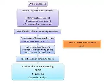 ENU is used as a genetic tool by designing a variety of genetic screens suitable to the researchers' interests. Depending on the region being assessed, forward genetic screens can be classified as illustrated in Figure 2 as:[8]