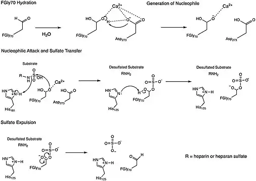 One of the proposed mechanisms for the N-sulfoglucosamine sulfohydrolase, depicted in the figure above, was inspired by a mechanism determined for a sulfatase enzymes, which similarly cleave sulfate ester groups from their substrates.[4] The N-sulfoglucosamine sulfohydrolase mechanism involves four key residues found in the enzyme active site: formylglycine (FGly70), two histidines (His125 and His181), and aspartic acid (Asp273). The formylglycine residue (FGly70) is first hydrated to form a geminal diol whose hydroxyl group subsequently coordinates with a Calcium(II) ion in the active site. A neighboring aspartic acid residue (Asp273) then acts as a base to deprotonate the coordinated hydroxyl group in the geminal diol, which acts as a nucleophile to the sulfate group on the substrate and leads to the cleavage of the substrate nitrogen-sulfur bond. A proximal histidine residue (His181) is proposed to donate a proton as a replacement for the sulfate group that was involved in the nitrogen-sulfur bond. At this point, the formylglycine (FGly70) has the sulfate group attached adjacent to a hydroxyl group, which is believed to be deprotonated by a second histidine group (His125) so that the negatively-charged oxygen atom can participate in the removal of the sulfate group from the residue. This final step liberates the enzyme from the sulfate group.[2]