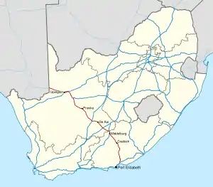 The N10 is a national route in South Africa connecting Gqeberha on the Eastern Cape coast with the Namibian border at Nakop, via Cradock, De Aar and Upington.[1]
