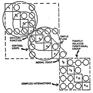 Where a blank appears, there is no interface between the respective functions. Data flows in a clockwise direction between functions (e.g., the symbol F1 F2 indicates data flowing from function F1, to function F2). The data being transmitted can be defined in the appropriate squares. Alternatively, the use of circles and numbers permits a separate listing of the data interfaces. The clockwise flow of data between functions that have a feedback loop can be illustrated by a larger circle called a control loop. The identification of a critical function is also shown in Figure 3, where function F4 has a number of inputs and outputs to all other functions in the upper module. A simple flow of interface data exists between the upper and lower modules at functions F7 and F8. The lower module has complex interaction among its functions. The N2 chart can be taken down into successively lower levels to the hardware and software component functional levels. In addition to defining the data that must be supplied across the interface, the N2 chart can pinpoint areas where conflicts could arise.[4]