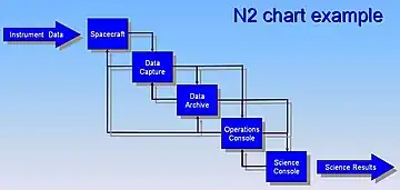 The N 2 chart, also referred to as N 2 diagram, N-squared diagram or N-squared chart, is a diagram in the shape of a matrix, representing functional or physical interfaces between system elements. It is used to systematically identify, define, tabulate, design, and analyze functional and physical interfaces. It applies to system interfaces and hardware and/or software interfaces.[2]