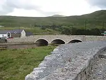 The N59 road is a national secondary road in Ireland. It commences in County Sligo, south of Sligo Town at the Belladrehid interchange with the N4 north of Ballysadare. The route circles around the west of Ireland, passing west from Sligo into County Mayo and through Ballina. The N59 continues around Mayo, proceeding indirectly to Westport. Continuing south through Mayo into County Galway, the road passes through the village of Leenaun. The 182-year-old bridge in the centre of the village, carrying the road across the River Lahill, collapsed in floods on 18 July 2007. Due to the local terrain and road network, the diversionary route for getting from the south of the village to Westport was 110 km long. A temporary bridge was opened eight days after the floods, on 27 July. It has since been replaced by a new bridge.