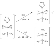 NAMI-A is considered a pro-drug formulation that becomes active upon hydrolysis. At pH 7.4, a chloride is replaced by water giving a charge-neutral aquo complex. At lower pH, imidazole is cleaved and replaced with water.[4]