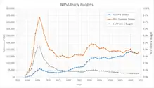 As a federal agency, the National Aeronautics and Space Administration (NASA) receives its funding from the annual federal budget passed by the United States Congress. The following charts detail the amount of federal funding allotted to NASA each year over its history to pursue programs in aeronautics research, robotic spaceflight, technology development, and human space exploration programs.
