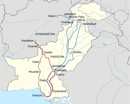 There were two routes from Pakistan to Afghanistan (both were closed in November 2011 following the Salala incident[4] and reopened in July 2012). Both routes started in Karachi, Pakistan's principal port in its southern Sindh province, on the Arabian Sea. From there, one route crossed the Khyber Pass, entered Afghanistan at Torkham, and terminated at Kabul, supplying northern Afghanistan. This route was approximately 1,000 miles long.[1] The other passed through Balochistan Province, crossed the border at Chaman, and ended at Kandahar, in the south of Afghanistan.[5]