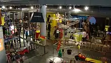 The main concepts on the first floor are DNA and chain reactions which include a room with giant dominoes with contraptions like a giant bell and a flying car. Also on the first floor is a show on the half-hour, which features a large chain reaction circuit.