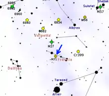 Messier 71 (also known as M71 or NGC 6838) is a globular cluster in the small northern constellation Sagitta. It was discovered by Philippe Loys de Chéseaux in 1745 and included by Charles Messier in his catalog of non-comet-like objects in 1780. It was also noted by Koehler at Dresden around 1775.[8]