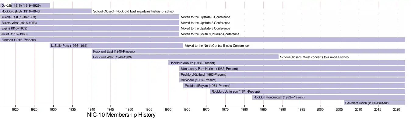 The league became the NIC-9 when Rockford West was closed after the 1988β89 school year, and reverted to NIC-10 when Belvidere North High School opened in 2007. Freeport High School remains the only original member of the conference.