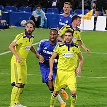 Maribor started their 2013–14 European campaign in the second qualifying round of the 2013–14 UEFA Champions League with a 2–0 aggregate victory over Birkirkara from Malta.[82] In the third qualifying round, Maribor eliminated APOEL on away goals rule,[83] securing their place in the play-off round for the second season in a row.[84] However, Maribor once again lost in the play-off round and continued their European season in the group stages of the Europa League for the third time in a row.[85] On 19 September 2013, the team played its first match in the group stage of the Europa League and were defeated by the Russian side Rubin Kazan.[86] On 24 October 2013, Maribor defeated Zulte Waregem 3–1 in Belgium, securing their first ever away victory in the Europa League group stages.[87] On 12 December 2013, Maribor defeated Wigan Athletic 2–1 and qualified for the Europa League Round of 32 for the first time, finishing in the second place with seven points out of six games.[88][89] In the Round of 32, Maribor played in a two-legged tie against the Spanish side Sevilla (who later won the competition) and lost 3–2 on aggregate.[90]