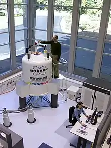 As of 1996, CW instruments were still used for routine work because the older instruments were cheaper to maintain and operate, often operating at 60 MHz with correspondingly weaker (non-superconducting) electromagnets cooled with water rather than liquid helium. One radio coil operated continuously, sweeping through a range of frequencies, while another orthogonal coil, designed not to receive radiation from the transmitter, received signals from nuclei that reoriented in solution.[15] As of 2014, low-end refurbished 60 MHz and 90 MHz systems were sold as FT-NMR instruments,[16] and in 2010 the "average workhorse" NMR instrument was configured for 300 MHz.[17]