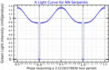 NN Serpentis (abbreviated NN Ser) is an eclipsing post-common envelope binary system approximately 1670 light-years away.[3] The system comprises an eclipsing white dwarf and red dwarf. The two stars orbit each other every 0.13 days.[3]