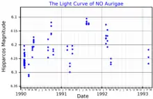 NO Aurigae is listed in the General Catalogue of Variable Stars as a slow irregular variable, indicating that no regularity could be found in the brightness variations. Other studies have suggested possible periods of 102.1, 173, and 226 days, and would classify it as a semiregular variable star.[10] The maximum visual magnitude range is 6.05–6.50.[10]