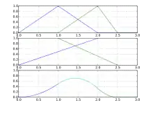 rises linearly from zero to one on the interval where is non-zero, while falls from one to zero on the interval where is non-zero. As mentioned before, is a triangular function, nonzero over two knot spans rising from zero to one on the first, and falling to zero on the second knot span. Higher order basis functions are non-zero over corresponding more knot spans and have correspondingly higher degree. If is the parameter, and is the th knot, we can write the functions and as