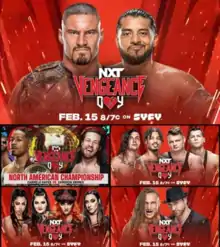 Vengeance was originally established as a pay-per-view (PPV) event for WWE in 2001 and it was held annually until 2007, followed by a one-off event in 2011. In February 2021, WWE revived Vengeance for the NXT brand as a TakeOver event called Vengeance Day, and it aired on PPV and the WWE Network. Its title was also a reference to its Valentine's Day scheduling.[1] The TakeOver series was then discontinued in September 2021.[2] On January 25, 2022, however, WWE announced that Vengeance would continue under the Vengeance Day name, but unlike all previous Vengeance events, the 2022 Vengeance Day would be held as a special episode of NXT. The 10th event in the Vengeance chronology, it was scheduled to be held on February 15, 2022, at the WWE Performance Center in Orlando, Florida. This in turn established Vengeance Day as NXT's annual Valentine's event. Additionally, due to USA Network's broadcasting of the 2022 Winter Olympics in NXT's normal slot, the television special aired on Syfy.[3]