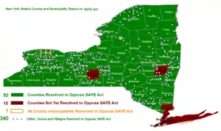 Support for the SAFE Act was strongly polarized by region, with strong support in New York City and its suburbs, but heavy opposition in upstate New York.[27] Fourteen months after its passage, a Siena College poll showed that 63% of registered New York voters statewide said that they support the SAFE Act, but only 45% upstate voters did.[28] The New York Times reported that in Upstate New York, "Counties, towns and villages have passed resolutions denouncing the laws, and some counties have even demanded that their official seals not be used on any paperwork relating to them. In response to an open records request, the governor's office shared hundreds of pages of such resolutions, from far-flung places like the Adirondack town of North Hudson, with 238 residents, to more populous areas like Erie County."[27] By contrast, Manhattan District Attorney Cyrus R. Vance, Jr. (D‑NY) strongly supported the law, saying that it would "provide law enforcement with stronger tools to protect our communities from gun violence, including provisions that better enable us to combat gun trafficking and violent gangs, and others that close the state gun show loophole and regulate large-quantity sales of ammunition and firearms."[29]