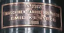 In 1889, five well-and-side-tank locomotives with a 0-4-0 wheel arrangement, the first locomotives of the NZASM, were obtained from the German engineering firm and locomotive builder Maschinenfabrik Esslingen, owned by Emil Kessler. Since the NZASM classified its locomotives according to their weight, these engines were known as 14 Tonners. They were erected at Elandslaagte near Johannesburg, now the city of Germiston. The engines were numbered in the range from 1 to 5 and placed in service on the new railway to Boksburg.[1][2]