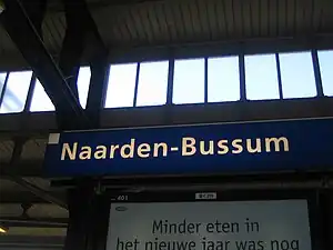 Naarden-Bussum is a railway station in the north of Bussum, Netherlands that also serves the neighboring community of Naarden. The station has one standard platform and one island platform. It has a total of four tracks, of which one track is for passing trains only. The station was opened on 10 June 1874. The station is on the Amsterdam - Hilversum - Amersfoort line, known as the Gooilijn. The station was also used as a tram station for the Bussum - Huizen tram service from 1883 to 1958.