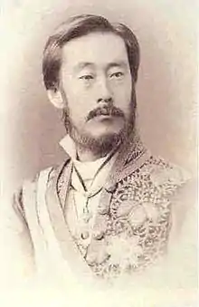 With the abolition of the han system, he surrendered his domain to the central government, and departed Japan with his two younger brothers for studies in Great Britain starting 1871.[1] He was appointed plenipotentiary minister to Rome in 1880, and returned to Japan in 1882. During his stay in England, he was appointed as official representative of Japan to the Court of St. James's by the Japanese government. After his return to Japan, he served in various political capacities, including president of the Genrōin, advisor to Emperor Meiji (and later Emperor Taishō), and as a member of the House of Peers. He was created marquis (侯爵, kōshaku)) in the Peerage Act of July 7, 1884.[1] From 1911, he was president of Kokugakuin University.