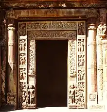 The entrance to the sanctum (garbhagriha) has multiple columns, each decorated with carvings, with none monolithic. At their base is a (Kalasha). The lintel are also intricately carved. The doorway is flanked by guard figures in the lower part with Ganga with river crocodile and Yamuna with river turtle. Beside them towards the inside are symmetrically placed graceful Shaiva dvarapalas (door guardians), each holding the trident. Each is relatively larger than the river goddesses, but about 1 foot (0.30 m) in height. Concentric to the entrance are panels of intricate carvings. The first panel has floral and geometric motifs from the 5th century. Concentric to these are 10 friezes, 5 on each side above the river goddesses. These carvings show courtship and love making scenes (mithunas). On top of the lintel of the doorway are seated men and women miniatures shown as if they are leaning in and peering into the center of the sanctum. The style of sanctum door has stylistic similarities with those found in the Lakshmana Temple in the Sirpur Group of Monuments in Chhattisgarh.[4][15][21]