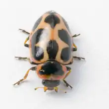 Naemia seriata, commonly known as the seaside lady beetle, is a large coccinellid beetle native to North America, and the only species in the genus Naemia. It is found in coastal areas such as beaches, salt marshes, and bay islands on the Atlantic and Pacific coast. This beetle is light brown, yellow, orange, or red in color, with large black spots, often connected along the sides. The pronotum usually has one large central black spot, which is occasionally split into two spots.[1] The body of this species is elongately oval in shape, and between 4 and 6.7mm in length.[2] The two subspecies can be distinguished by markings on the head, with the head of N. seriata seriata being black, while the head of N. seriata litigiosa has a pale triangular marking. Naemia seriata seriata is primarily distributed across Eastern North America, while N. seriata litigiosa is restricted to the American Southwest.[3]