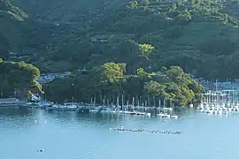 Nagahama Castle is located on a small hill with an elevation of 30 meters on Suruga Bay south of downtown Numazu. The castle is very small, with a length of only 100 meters. and consists of terraces built along the contour of the hill, protected by clay walls and dry moats. Vulnerable portions of the ramparts were faced with cut stone. The route to the inner bailey zigzagged through the second and third bailey, with gates in between. The top of the castle overlooks the anchorage of Uchiura, which was strategic for the Late Hōjō clan and later the Takeda clan. [2]