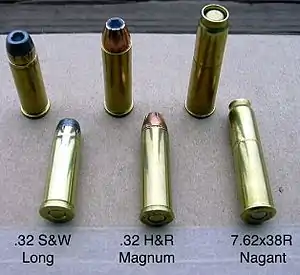 Three other cartridges—.32 S&W, .32 S&W Long, and .32 H&R Magnum—will also generally chamber and fire in the revolver, but will not achieve the gas seal. The case head of the .32 S&W/H&R is about the same size as the case diameter of the Nagant cartridge, so the case head will sometimes actually end up moving into the chamber, thus preventing an adequate primer strike. Due to the dimensional differences between these cartridges and the original 7.62×38R cartridge, this practice is done at the shooter's own risk. The .32 H&R Magnum in particular develops much higher pressures than the 7.62 Nagant or either of the .32 S&W cartridges, which are both late 19th century developments. The most common anomaly when firing these cartridges is bulged cases.[6]