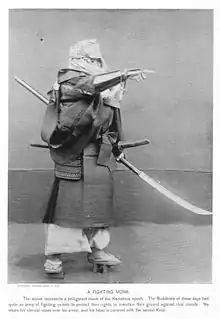 However, according to Karl Friday, there were various notations for naginata in the Heian period and the earliest physical evidence for naginata was in the middle of the Kamakura period, so there is a theory that says when they first appeared is unclear.[10] Earlier 10th through 12th century sources refer to "long swords" that while a common medieval term or orthography for naginata, could also simply be referring to conventional swords; one source describes a naginata being drawn with the verb nuku (抜く), commonly associated with swords, rather than hazusu (外す), the verb otherwise used in medieval texts for unsheathing naginata.[10] Some 11th and 12th century mentions of hoko may actually have been referring to naginata.[13] The commonly assumed association of the naginata and the sōhei is also unclear. Artwork from the late-13th and 14th centuries depict the sōhei with naginata but do not appear to place any special significance to it: the weapons appear as just one of a number of others carried by the monks, and are used by samurai and commoners as well.[14] Depictions of naginata-armed sōhei in earlier periods were created centuries after the fact, and are likely using the naginata as a symbol to distinguish the sōhei from other warriors, rather than giving an accurate portrayal of the events.[15]