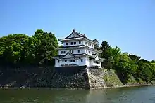 Called the Tatsumi turret, the southeast turret (東南隅櫓 Tōnan-sumi Yagura[30]) looks like it has two stories, but it actually has three. The white coating on the mud walls made the structure both waterproof and fireproof. The southeast turret is similar to the southwest turret. The construction adheres to the original Tokugawa design. The symbol of a hollyhock, the crest of the Tokugawa clan, can be seen on the ridge-end tiles. The turret has been designated an Important Cultural Asset.[15]