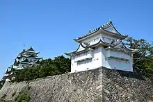 Also called Inui turret, the northwest turret is a three-storey structure with a roof at each level. The top layer, designed in the irimoya style, is covered with tiles. Many materials were taken from previous structures in Kiyosu Castle to construct this tower; it is therefore also called the Kiyosu turret.[54] It is designated an important cultural asset.[15]