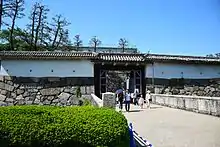 The whole gate structure was built around 1612. The barbican tower was damaged in the earthquake of 1891, and later completely removed. Detailed measurements and architectural drawings were made in the early Shōwa era.[31] The first gate burnt down in the air raid of 1945, leaving only the stone basis and the smaller second gate. Since the second gate is in its original state, it has been designated an Important Cultural Asset.[15]