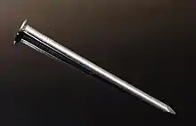 In woodworking and construction, a nail is a small object made of metal (or wood, called a tree nail or "trunnel") which is used as a fastener, as a peg to hang something, or sometimes as a decoration.[1] Generally, nails have a sharp point on one end and a flattened head on the other, but headless nails are available. Nails are made in a great variety of forms for specialized purposes. The most common is a wire nail.[2] Other types of nails include pins, tacks, brads, spikes, and cleats.