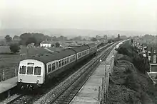 When the railways were nationalised in 1948, the GWR became the Western Region of British Railways.[1] Goods traffic from the station ceased on 1 June 1964. The main station buildings were demolished in the 1970s, but their foundations can still be seen behind the shelters on the eastbound platform.[1][26] The shelter on the westbound platform was still present in 1986.[27] In the 1980s the car park was expanded, and new metal and glass shelters were provided.[1] The station reverted to the name "Nailsea" on 6 May 1974,[1] and was still known by that name at the end of 1994.[Note 3]