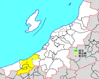* yellow - areas formerly within the district borders during the early Meiji period
