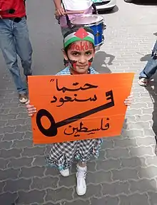 Meron Benvenisti writes that it was "…Israeli Arabs who taught the residents of the territories to commemorate Nakba Day."[10] Palestinians in the occupied territories were called upon to commemorate 15 May as a day of national mourning by the Palestine Liberation Organization's United National Command of the Uprising during the First Intifada in 1988.[11] The day was inaugurated by Yasser Arafat in 1998.[12]
