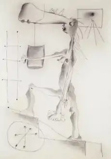 According to the Joan Miró Foundation, "Miró's despondency brought about by the moral tragedy of the war can be seen in the violent metamorphosis of the figure, in her heavy limbs and in the effort involved in climbing."[4] At the top right is a kind of window or box where light rays can be seen entering the room. The woman is using her right arm to try to grab a ladder – this was a symbol that Miró used in several of his works to represent evasion or escape. The external genitals of the woman are similar to those of the woman in Man and Woman in Front of a Pile of Excrement as they are exaggerated in size.[5] This work is said to be related to Marcel Duchamp's 1912 painting Nude Descending a Staircase, No. 2, although here the woman is ascending. The distortion and effort of the figure are interpreted as mirroring the Spanish Civil War.[4] Duchamp's painting was not original; it alluded to the earlier photographs by Eadweard Muybridge[6] which were amongst the first to record animal locomotion. Miró first saw this work by Duchamp in 1912, during the Cubist art exhibition held at Galeries Dalmau in Barcelona.[7][8]