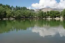 Nako Lake, a small lake at elevation 3,636 metres (11,929 ft) in the Kinnaur district, is 103 kilometres (64 mi) away from the district headquarter town of Reckong Peo.[10] The lake is an integral part of the Nako village, which is created on the slopes of the Reo Purgyal mountain of the Srikhand range. During the evening twilight hours a very large number of birds flock the lake.[5] There is a rock here which is believed to have the foot print of Padmasambhava.,[3] recording his visit to the area.[7] A shrine has been built around this foot print and there is also stucco statue of Padmasambhava above it in addition to murals. The periphery of the lake has plantations of willow and poplar trees. The lake has boating facilities during the summer months and ice skating is practiced on the lake's surface which gets frozen during the winter months.[4][2]
