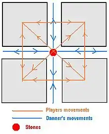 Four players stand in their squares and four stones one above the other are placed at the center. The objective of each player is to have a stone without being captured by the denner. The objective of the denner is to capture the players who move in their way.