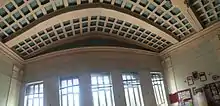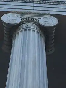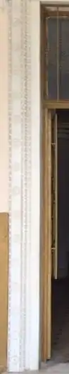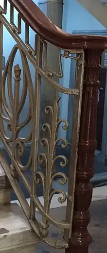 The repetition of plasters between rectangular windows make pattern on the facade. The entrance is defined by high platform and two Ionic column. Inside, there are two Doric columns are following the two Ionic columns. Timber is used on the handrail. There are floral motives on the balustrades. The building has many marble ornamentation and coffer ceiling. It has 2 terraces facing the garden.