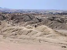 The Namib (/ˈnɑːmɪb/ NAH-mib;[1] Portuguese: Namibe) is a coastal desert in Southern Africa. The name Namib is of Khoekhoegowab origin and means "vast place". According to the broadest definition, the Namib stretches for more than 2,000 kilometres (1,200 mi) along the Atlantic coasts of Angola, Namibia, and South Africa, extending southward from the Carunjamba River in Angola, through Namibia and to the Olifants River in Western Cape, South Africa.[2][3][4] The Namib's northernmost portion, which extends 450 kilometres (280 mi) from the Angola-Namibia border, is known as Moçâmedes Desert, while its southern portion approaches the neighboring Kalahari Desert. From the Atlantic coast eastward, the Namib gradually ascends in elevation, reaching up to 200 kilometres (120 mi) inland to the foot of the Great Escarpment.[2] Annual precipitation ranges from 2 millimetres (0.079 in) in the aridest regions to 200 millimetres (7.9 in) at the escarpment, making the Namib the only true desert in southern Africa.[2][4][5] Having endured arid or semi-arid conditions for roughly 55–80 million years, the Namib may be the oldest desert in the world[2][5] and contains some of the world's driest regions, with only western South America's Atacama Desert to challenge it for age and aridity benchmarks.