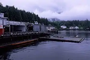 Namu is a small fishing port, former cannery town and First Nations community on the coast of British Columbia, Canada.[1] It is located about 95 km (59.0 mi) southwest of Bella Coola or 35 km (21.7 mi) SSE of Bella Bella, on the mainland shore of the Inside Passage ferry route directly opposite Hunter Island, and just south of the opening of Burke Channel and King Island. The community's harbour is named Namu Harbour,[2] and a large lake just inland is Namu Lake,[3] which lies in the short drainage basin of the 15 km Namu River,[4] immediately east of which is the small but rugged Namu Range.[5]