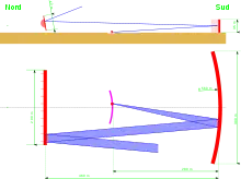 The large radio telescope is a transit telescope of the Kraus-type design. The primary mirror at the north end of the installation is a planar mirror measuring 200 m in width and 40 m in height. This is tiltable to adjust to the altitude of the observed object. It consists of five 20 m wide segments, each of 40 t mass. The radio waves are reflected horizontally into the secondary mirror 460 m to the South. The shape of the secondary is that of a segment of a sphere 300 m wide and 35 m high. The secondary reflects the radio waves back into its focal point 280 m to its North and about 60% the distance back to the primary. A cabin with further mirrors and the receiver is located at the focus. During an observation, the cabin is moved west to east to track the observed object for about an hour around its transit through the meridian.[4][1]
