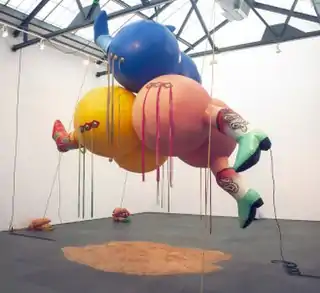 In 2005, a Creative Capital Artist Grant funded research for a new body of work—an exploration of the cowgirl archetype.[41][29] The results were exhibited in her solo shows, "Dustup" (2012) and "Let 'er Buck" (2013), and featured giant nylon inflatables together with other types of work. The piece Dustup (2012) is based, according to Davidson, on the classic-comic convention of portraying skirmishes as "dustballs" and takes the form of three bulbous, boot- and tassel-clad forms in pink, yellow and blue, suspended around a central point, "legs up."[35][49] The piece Let 'er Buck (2013) poses the pink character from Dustup singly, in a standing posture.[52]