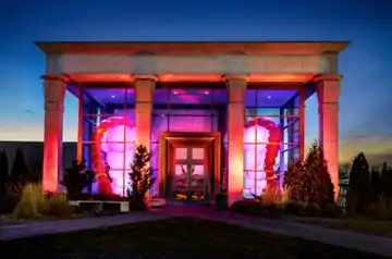 In 2020, Davidson collaborated with Lakshmi Ramgopal to create the exhibition "Hive" at the Krannert Art Museum, a year-long, immersive installation that includes sculpture, sound and light.[36][41] Two eighteen-foot-high Davidson sculptures fill the glass-enclosed entrance to the Krannert's Kinkead Pavilion, while a soundscape created by Ramgopal projects abstract vocalizations of breath, including inhales, sighs and hums. Davidson's Hive inflatables are soft, pink and rounded, and contrast with the hard, angular qualities of the postmodern-style pavilion. The dual sculptures are internally lit and flash in a programmed pattern.[36][21] Hive appears to have derived from a smaller, similar Davidson piece—Bigarurre—which was included in the artist's 2017–8 solo show, "Per Sway."[53][49]