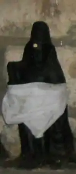 The Nandi in Sivalokanathar Temple, Tirupunkur is seen placed off centre as a testimony of Nandanar's devotion and the miracle. A stone image of the saint is worshipped in the temple.[15] The Dvarapalas (gate-keeper sculptures) are depicted with his heads leaning downwards, said to be in honour of Nandanar.[11] In 1959, a shrine was created outside the Shiva temple, from where the stone image of Nandanar looks eternally at Shiva. Nandanar is depicted with his hands joined above his head, praying to Shiva. Scenes of Bharati's opera and the local legend of Nandanar and Ganesha digging the temple tank are seen on the shrine.[10]
