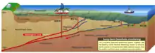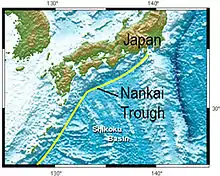 The Nankai Trough area was identified by the United States Department of Energy (DOE) and its United States Department of Energy National Laboratories (NETL) as an important hydrate-bearing region in the Asian-Pacific. DOE gas hydrate resource estimates indicate a hydrate potential of 16 to 27 trillion cubic meters.[1] Research has confirmed the presence of gas hydrates in two different locations within the Nankai Trough: the hydrates can be found in the accretionary prism off Shikoku and Tokai, and also in the back-arc basin system northwest of Japan. Nearly all of the natural gas hydrate accumulations identified in the Nankai Trough region occur at a depth of around 290 to 300 meters below the seafloor (1,240 meters below sea-level). The structure of the Nankai Trough is dominated by the development of this accretionary prism since the Miocene, which formed due to the northwestward trending subduction of the Philippine Sea plate beneath the Eurasian plate. The active subduction zone makes the Trough one of the most active earthquake zones on the planet. The subsiding segment of the Philippine plate is the so-called ‘Shikoku basin’, which defines a former forearc basin that was subsequently filled with sediments from submarine fan systems in the area, although most of the accreted sediments consist of coarse terrestrial clastics.[2]