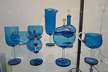 Her perhaps best known glass tableware design is the 1958 Harlekiini of simple geometric shapes in a deep Mediterranean blue.[5]