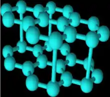 There are three main aspects in the structure of diamond nanoparticles to be considered: the overall shape, the core, and the surface. Through multiple diffraction experiments, it has been determined that the overall shape of diamond nanoparticles is either spherical or elliptical. At the core of diamond nanoparticles lies a diamond cage, which is composed mainly of carbons.[6] While the core closely resemble the structure of a diamond, the surface of diamond nanoparticles actually resemble the structure of graphite. A recent study shows that the surface consists mainly of carbons, with high amounts of phenols, pyrones, and sulfonic acid, as well as carboxylic acid groups, hydroxyl groups, and epoxide groups, though in lesser amounts.[7] Occasionally, defects such as nitrogen-vacancy centers can be found in the structure of diamond nanoparticles. 15N NMR research confirms presence of such defects.[8] A recent study shows that the frequency of nitrogen-vacancy centers decreases with the size of diamond nanoparticles.[9]