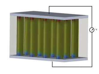 The direct current triboelectric nanogenerator (DC-TENG) is a new-type triboelectric nanogenerator that can harvest mechanical energy and convert it into electrical energy through the conjunction of triboelectric effect and electrostatic breakdown effect.[61][62] Different from the above-mentioned traditional triboelectric nanogenerators possessing standard AC output signal, in which the signal is generated by a conjunction of triboelectric effect and electrostatic induction effect, the DC-TENG produces a unidirectional current flow in the external circuit and can drive electronic devices and charge energy storage devices directly. When the direct current triboelectric nanogenerator is fabricated as rotary structure, it will produce continuous constant current, which can be utilized as constant current power supply at wide range of external load resistance. This new-type triboelectric nanogenerator was firstly invented in Profs. Zhong Lin Wang and Jie Wang group at Beijing Institute of Nanoenergy and Nanosystems in 2019. As a device for converting mechanical energy into electrical energy, this new-type triboelectric nanogenerator can be utilized in micro/nano power source or self-power sensing system.