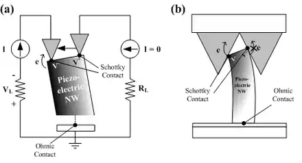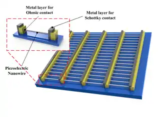 Other type. The fabric-like geometrical configuration has been suggested by Professor Zhong Lin Wang in 2008. The piezoelectric nanowire is grown vertically on the two microfibers in its radial direction, and they are twined to form a nanogenerator.[13] One of the microfibers is coated with the metal to form a schottky contact, serving as the counter electrode of VINGs. As the movable microfiber is stretched, the deformation of the nanostructure occurs on the stationary microfiber, resulting in the voltage generation. Its working principle is identical to VINGs with partial mechanical contact, thus generating DC electrical signal.